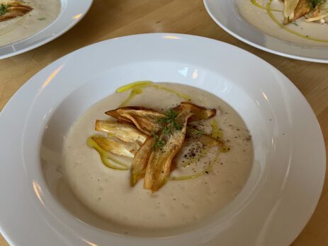 Die Köche bereiten in der Eventküche ein 4 Gänge Menü zu Eine kulinarische Verführung für sie und ihn. Ein Abend mit Kerzenschein und wunderbarem Essen in der Hofküche. Crémant zur Begrüßung Brot und Dip Tatar und Kaviar vom Saibling mit Spinat-Creme und Spinat-Salat Burrata, Grapefruit-Salat, Chicorée, Schokoladensauce vom Kalb rosa gebratener Rücken und geschmorte Bäckchen ,...